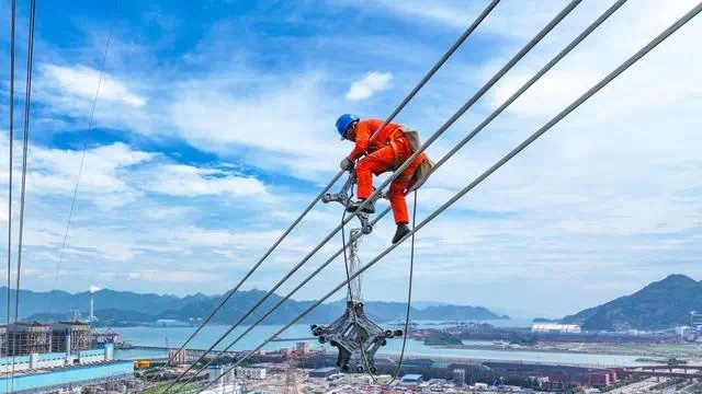 6月21日,國家電網福建送變電公司巡檢人員正在福建省連江縣坑園鎮可門電廠三期500千伏送出工程進行檢查。(國網福建電力供圖)