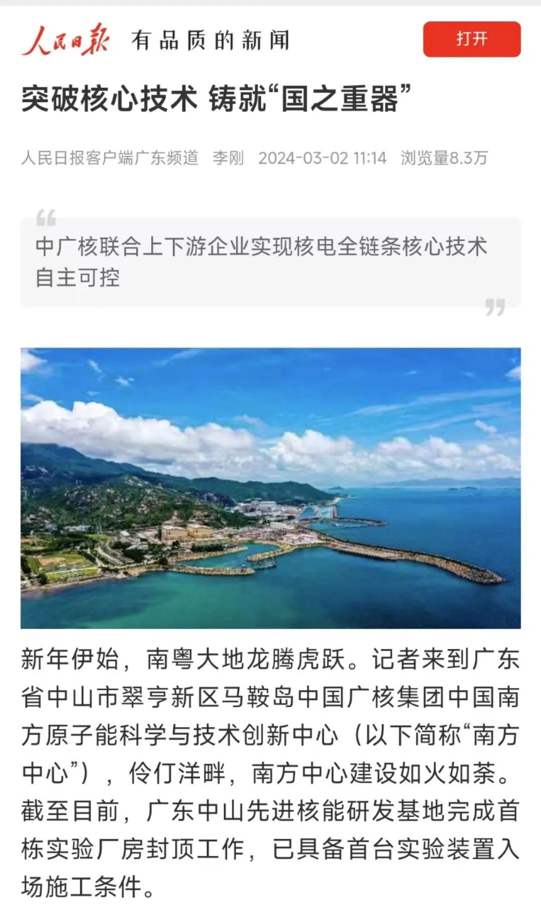 3月1日,人民日報刊發文章《突破核心技術 鑄就“國之重器”》,深入講述中廣核堅持以科技創新引領核能新質生產力發展,持續加大核心技術研發,著力打造我國新一代核電技術策源地,全力以赴推進高水平科技自立自強調生動案例。