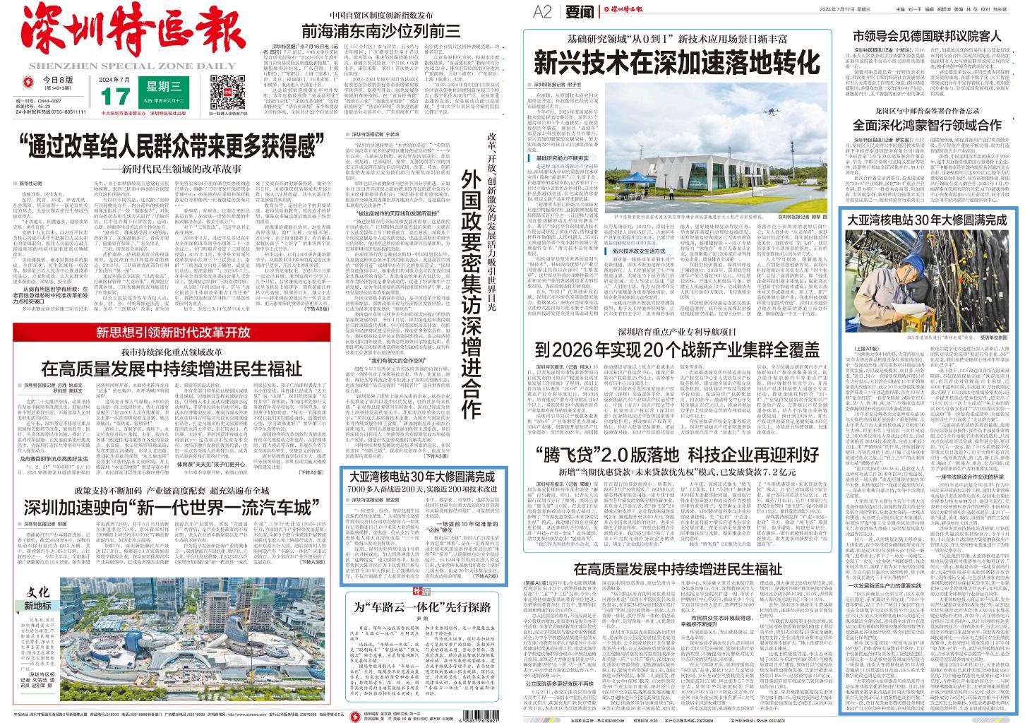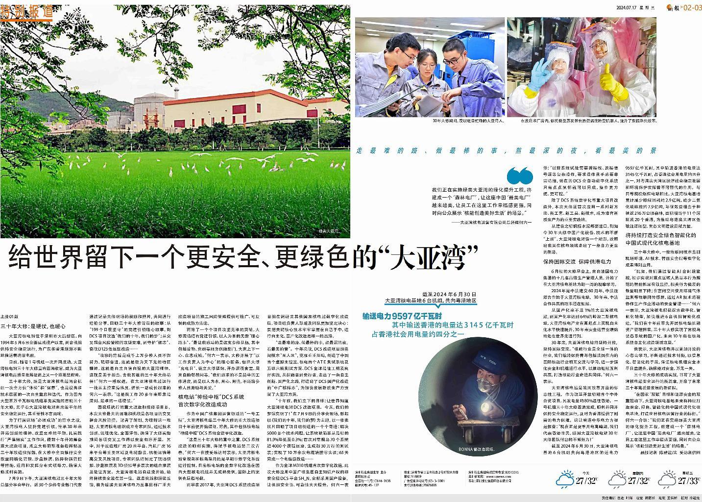 2024年7月17日,《深圳特區報》頭版和A02要聞版刊登稿件《大亞灣核電站30年大修圓滿完成》。文章聚焦報道大亞灣核電站完成中國大陸首座百萬千瓦級商用核電站30年大修,全面提升安全、數字化與可靠性,展現了自主創新與特區精神,為核電行業提供寶貴經驗。