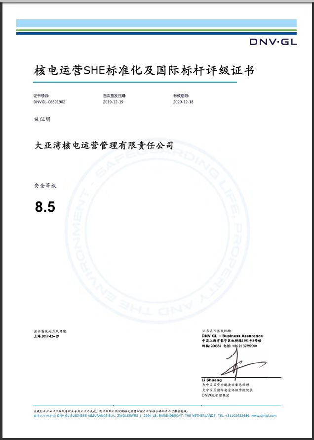 2019年12月,DNV?GL正式公布2019年大亞灣核電SHE標(biāo)準(zhǔn)化及國(guó)際標(biāo)桿評(píng)價(jià)報(bào)告,大亞灣核電運(yùn)營(yíng)有限責(zé)任公司的SHE標(biāo)準(zhǔn)化及國(guó)際標(biāo)桿評(píng)價(jià)等級(jí)為8.5級(jí),