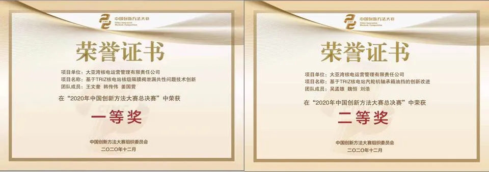 2020年12月3日-4日,2020年中國創新方法大賽總決賽在天津市舉行,本次大賽由科學技術部、中國科學技術協會、天津市人民政府主辦。經過各省市區域賽選拔,全國有206個項目隊參加總決賽。大亞灣核電運營管理有限責任公司(以下簡稱“公司”)的兩個創新團隊經省賽勝出代表廣東省參加國賽,王文奎領銜的《隔膜閥泄漏共性問題技術創新》項目團隊榮獲國賽一等獎,吳孟雄領銜的《汽輪機軸承箱油擋的創新改進》項目團隊榮獲國賽二等獎。